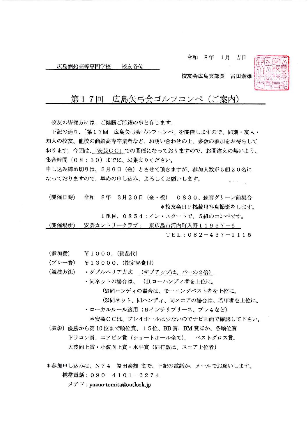 校友の皆様方には、ご健勝ご活躍の事と存じます。 下記の通り、「第17回 広島矢弓会ゴルフコンペ」を開催しますので、 知人の校友、他校の商船高専卒業者等、お誘いあわせの上、多数の参加をお待ちしております。 今回は、「安芸CC」での開催になっておりますので、お間違えの無いよう、 集合時間(08:30)までにお集まりください。 申し込み締め切りは、3月6日(金)とさせて頂きますが、参加人数が5組20名になっておりますので、 早めの申し込み、よろしくお願いいたします。 (開催日時) 令和8年3月20日(金・祝) 0830 練習グリーン前集合 …